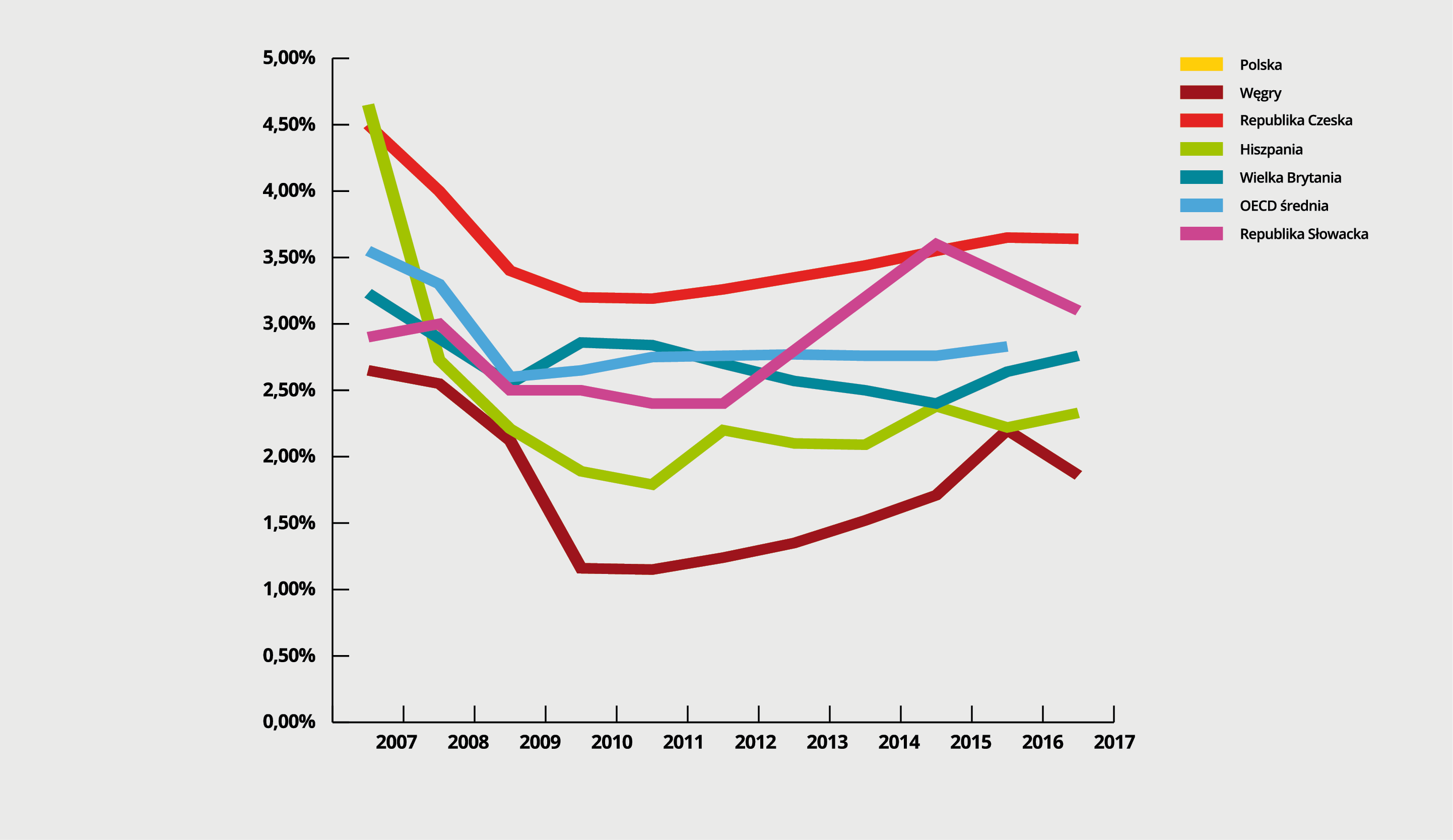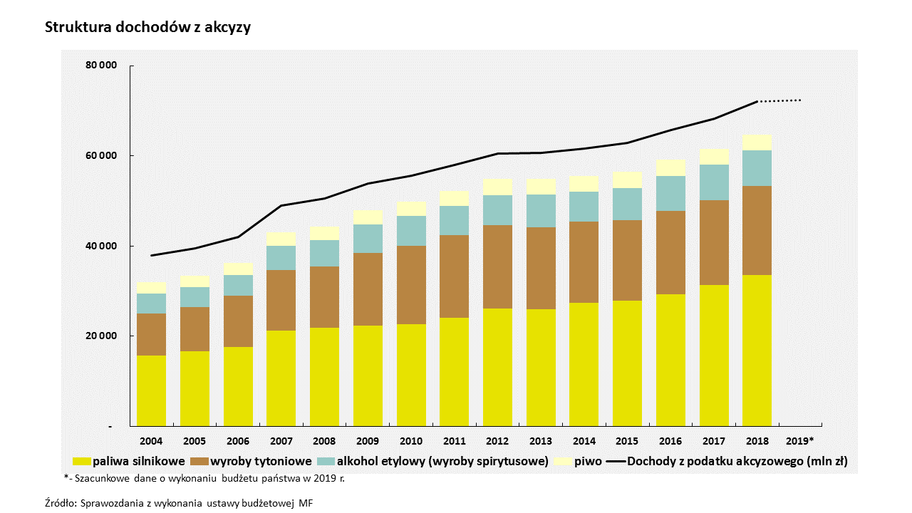Zgodnie z szacunkowymi danymi o wykonaniu budżetu państwa w 2019 r. (https://www.gov.pl/web/finanse/szacunek-2019) dochody z akcyzy wyniosły 72395,9 mln zł, co oznacza, że pozostały na niemal niezmienionym poziomie w stosunku do 2018 r. Taka sytuacja ostatni raz zdarzyła się w 2013 r. Warto podkreślić, że wskazane wartości dotyczą kwot nominalnych – nie uwzględniają zatem inflacji.